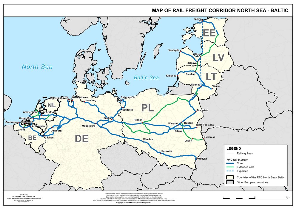 The RFC NS-B passes through seven countries: the Netherlands, Belgium, Germany, Poland, Lithuania, Latvia, Estonia. It stretches from the North Sea ports in Belgium, the Netherlands and Germany to Poland and continues north through Lithuania, Latvia and Estonia. To the South, the corridor extends from Berlin and Warsaw via Lublin to Dorohusk and from Magdeburg via Wrocław to Katowice to Medyka. Another branch goes from Warsaw to Kaunas, then to Riga and Tallinn.