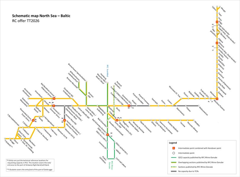 RC is offered as a guaranteed contingent of “capacity slots” for international freight paths per day, direction and section on Rail Freight Corridor North Sea - Baltic lines. On all RFC sections the number of guaranteed timeslots is one per day unless major TCRs prevent an offer.