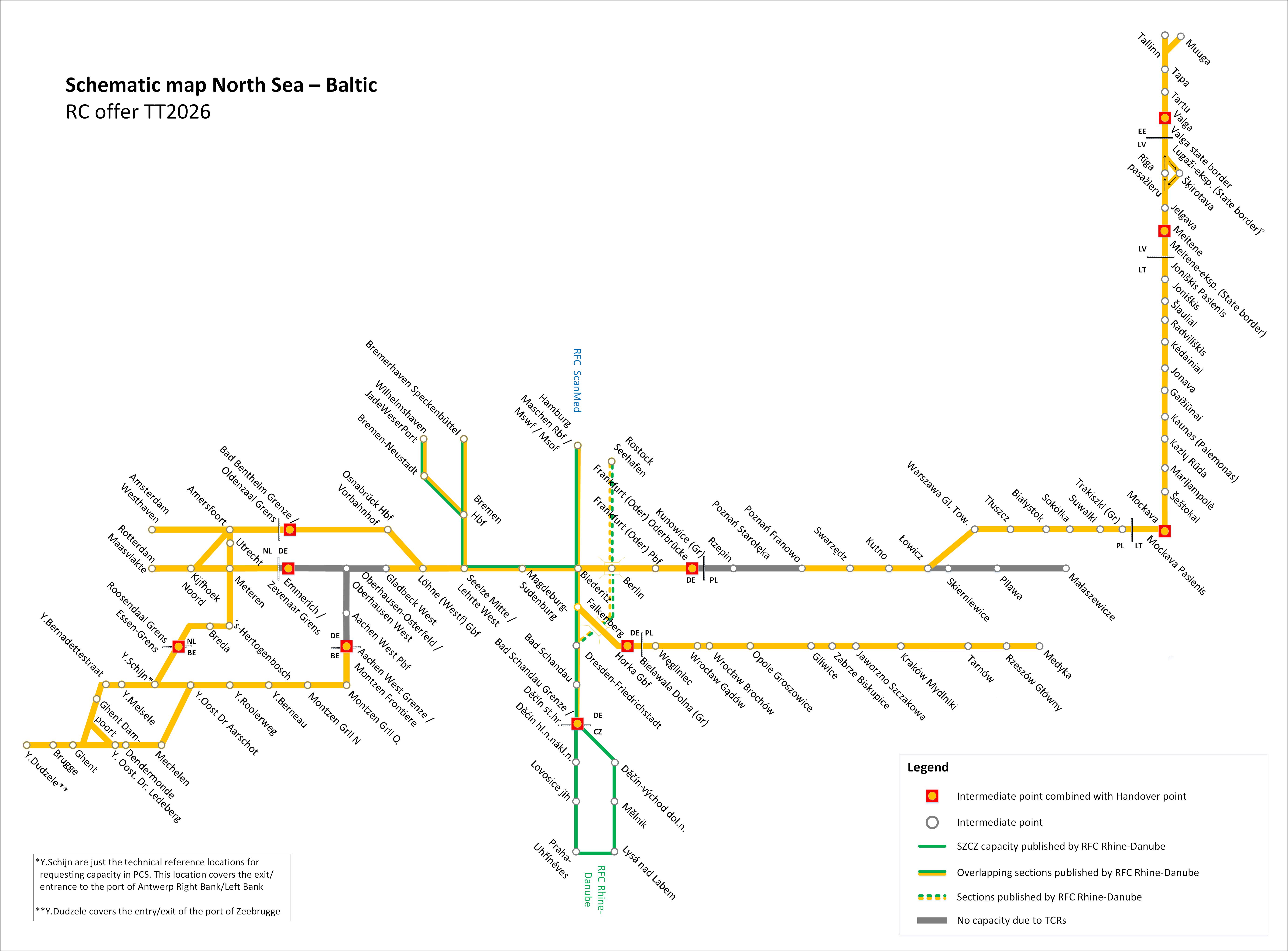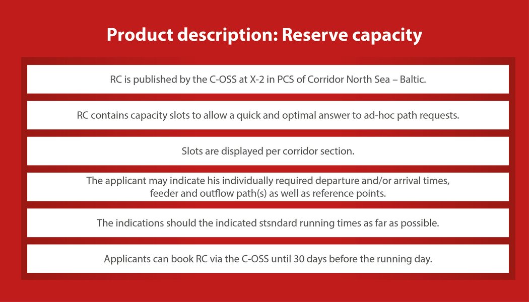 RC is offered as a guaranteed contingent of “capacity slots” for international freight paths per day, direction and section on Rail Freight Corridor North Sea - Baltic lines. On all RFC sections the number of guaranteed timeslots is one per day unless major TCRs prevent an offer.